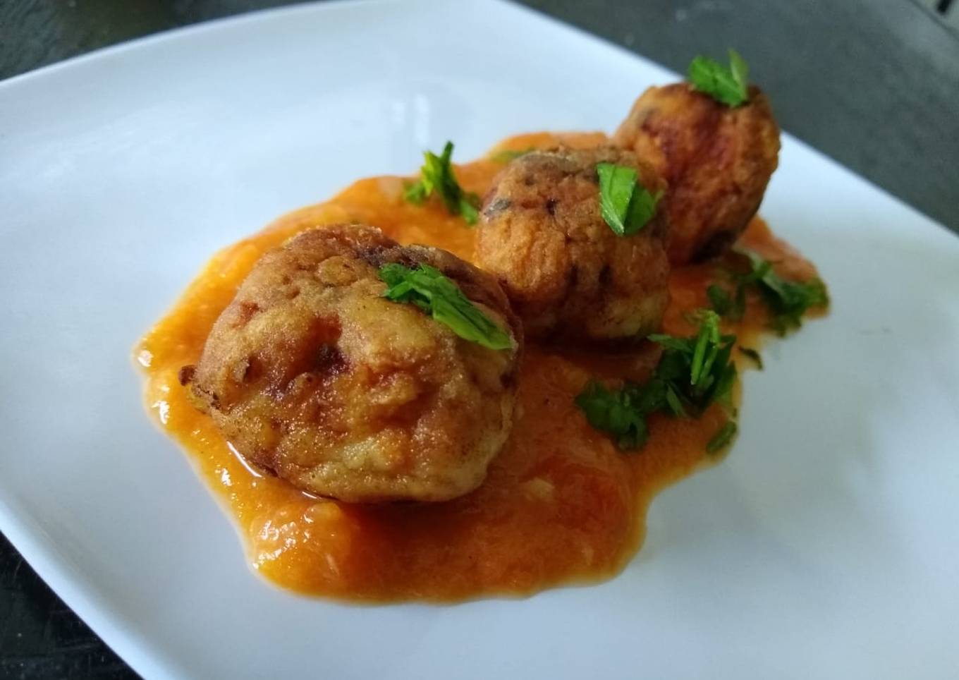 - Pasado este tiempo pasar las albóndigas por harina de trigo y freír en aceite bien caliente, servir con la salsa expres
