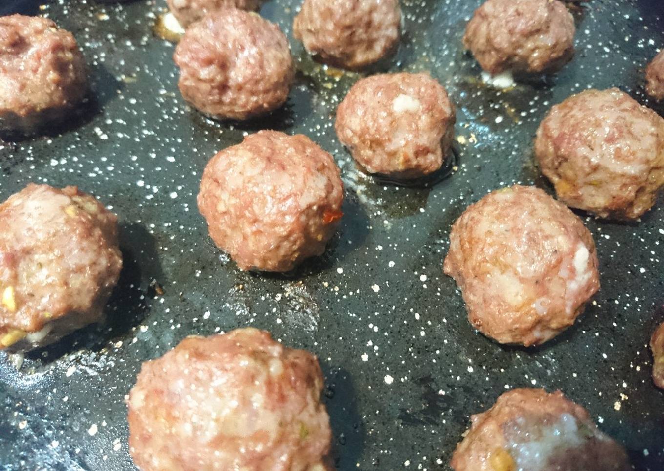 - Colocar en la palma de la mano un poco de la carne y un pequeño pedazo de queso en el centro. Armar una bolita.