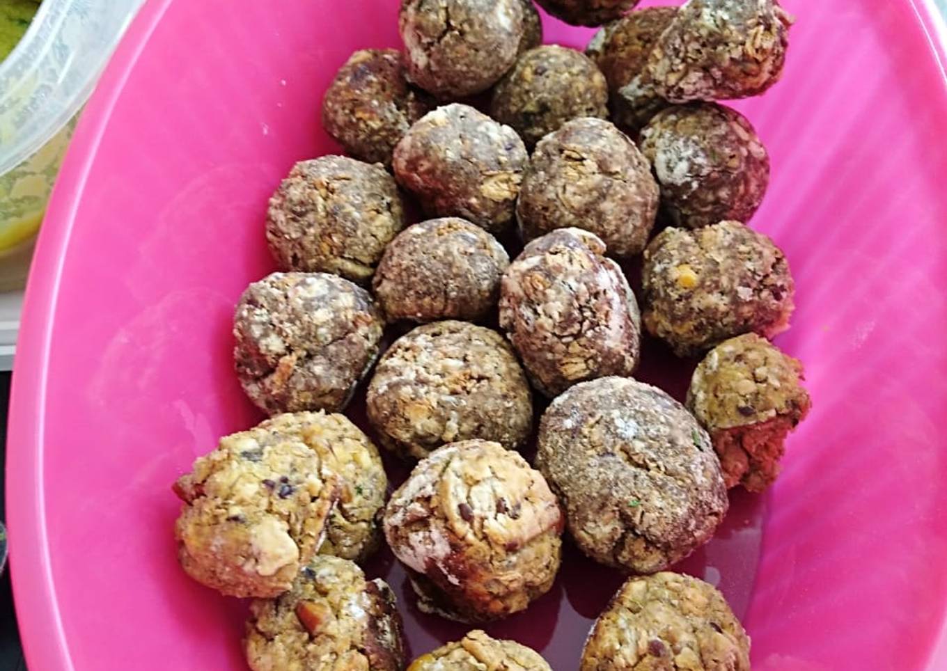 - Mezclar todo, dejar reposar un rato, para que la avena haga su efecto de liga reemplazando el huevo y luego dar forma de albóndiga a la mezcla