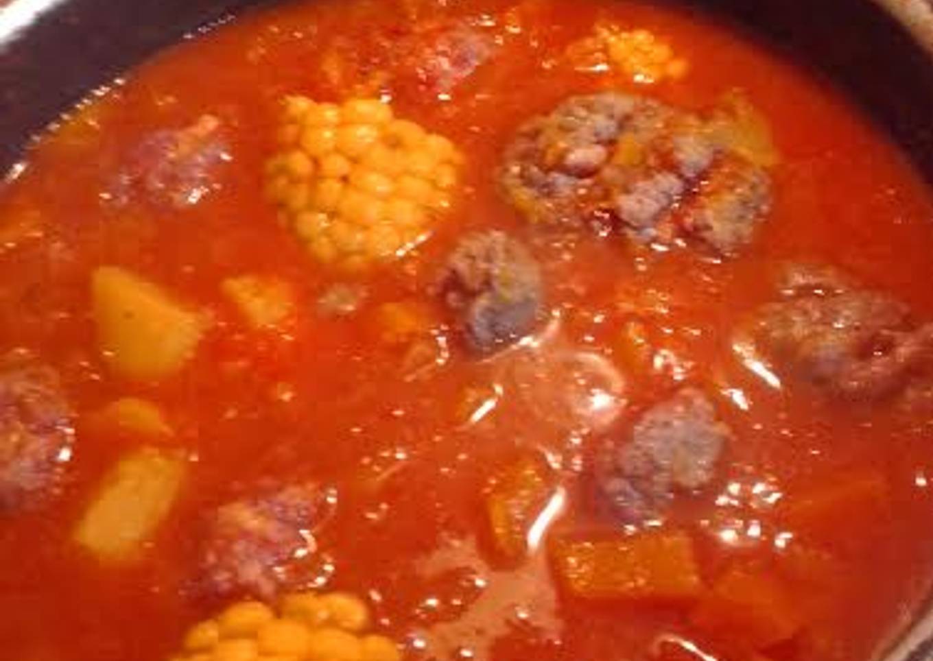 - Cuando la salsa este hirviendo ir agregando suavemente las albondigas. Dejar cocinar, ir verificando la coccion de todos los ingredientes. Cuando este listo, se sirve y Glup! Buen provecho!!!!