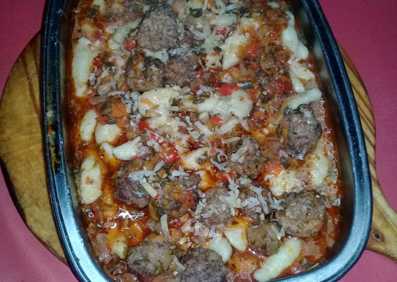 - Por último ponemos en una fuente un poco de salsa, agregamos los ñoquis con las albóndigas y agregamos un poco más de salsa y queso rallado y listo a disfrutar.