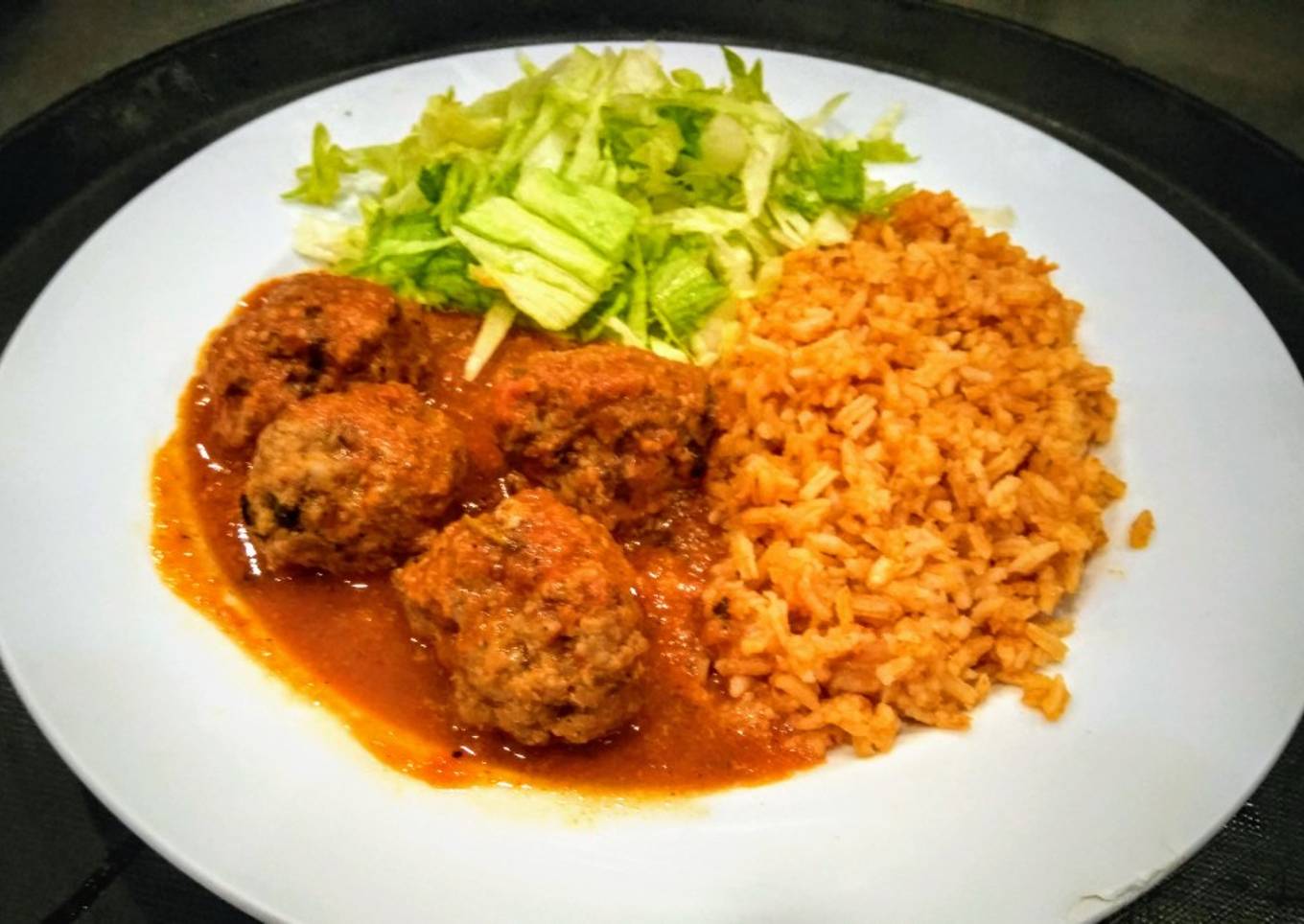 - Ya listo todo, se montan en un plató grande primero servir el arroz, después la lechuga y por último 4 o 5 albóndigas y de ahí bañarlas con la salsa